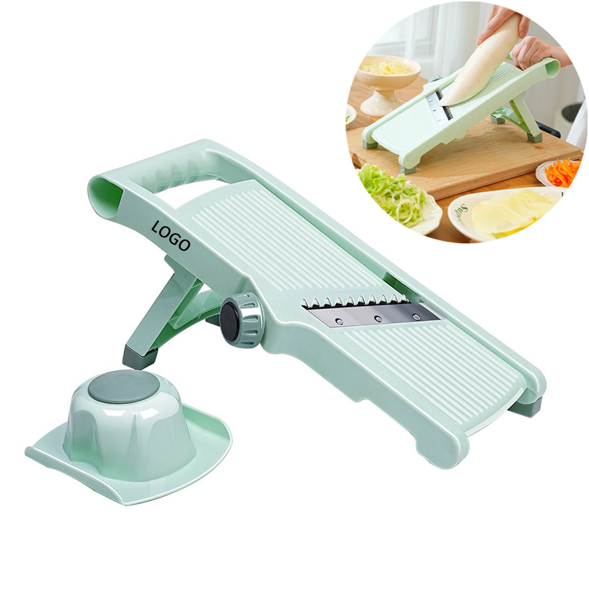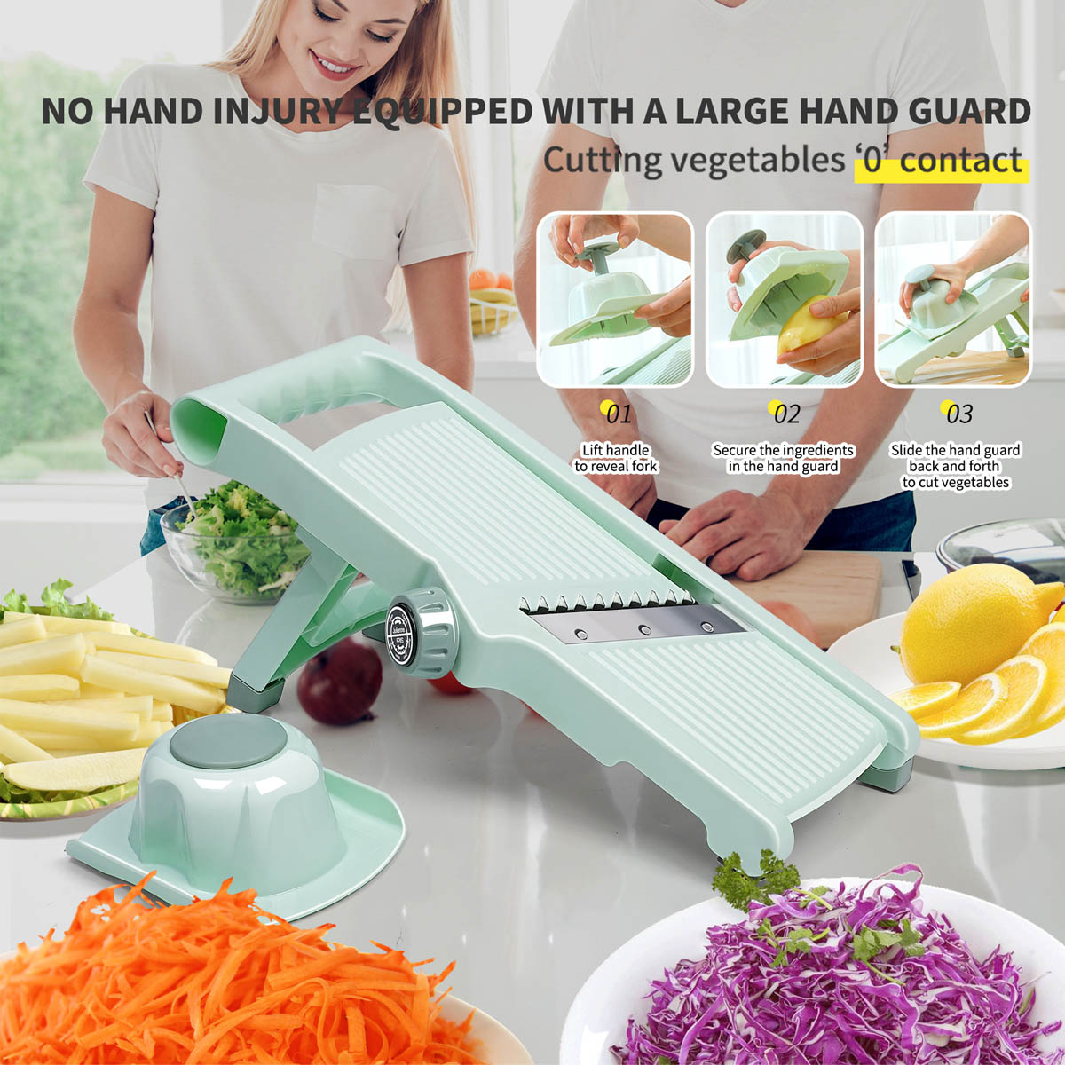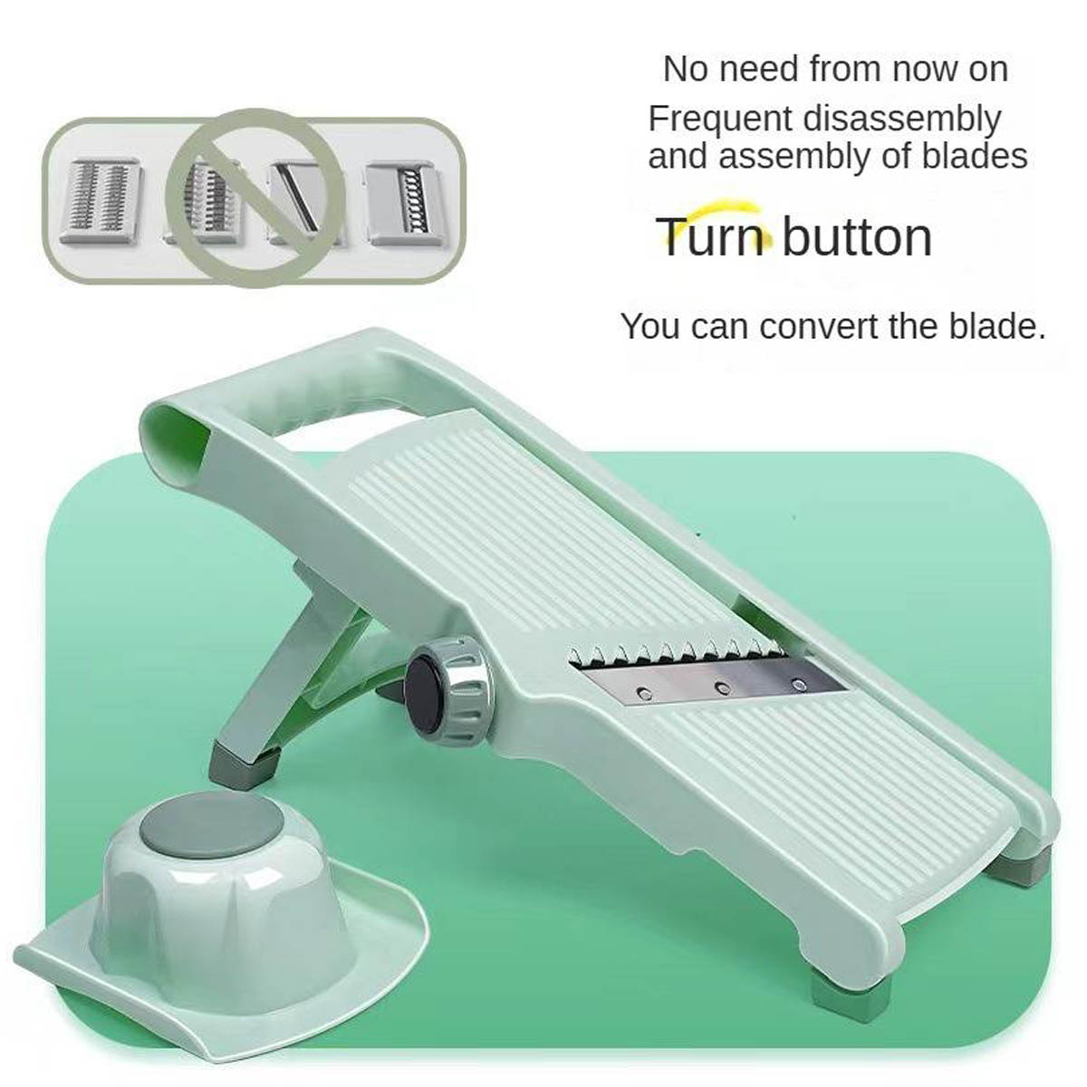 Mandolin Slicer with Protection Tool: Mandolin Slicer has all slicing options built. Just turn the switch to change the cutting option, you don’t need to touch the blade, the pusher design protects your hand from damage.